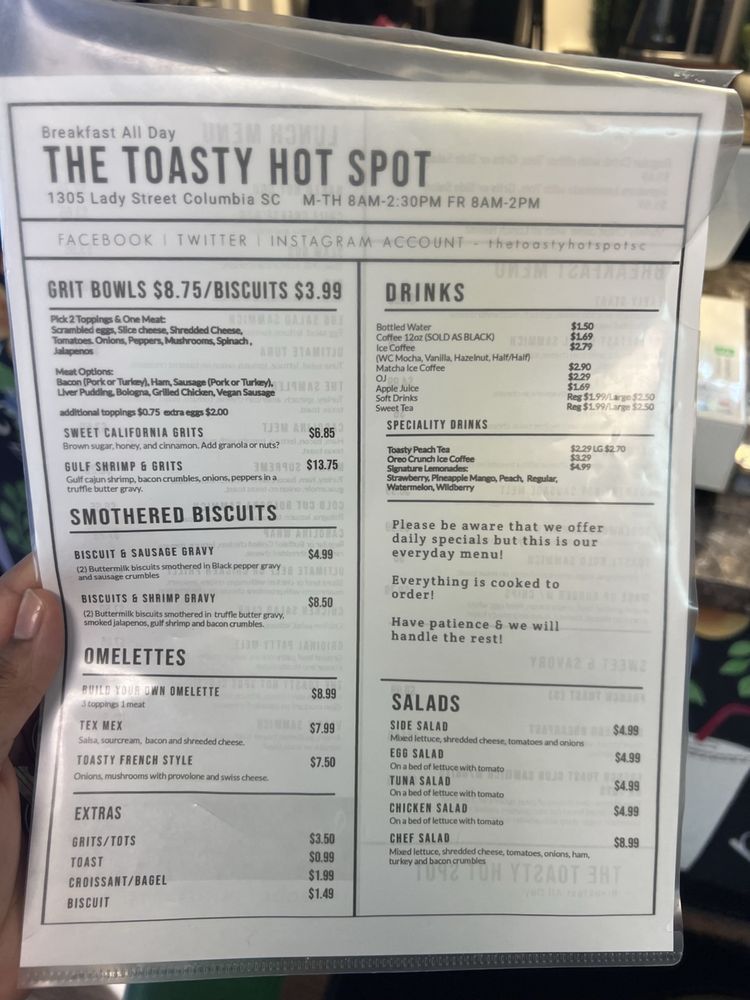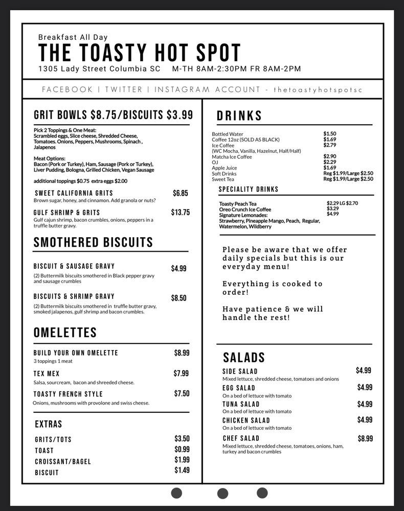 Welcome to The Toasty Hot Spot, your new go-to destination for delightful breakfast and brunch sandwiches in Columbia, SC. Nestled at 2002 Greene St A, this cozy spot offers a mouthwatering menu designed to satisfy your cravings. Highlights include the rich Lowcountry Biscuits & Sausage Gravy, a classic Southern dish that warms the soul, and the Bayou Shrimp & Grits, a fusion of Gulf shrimp, bacon, and peppers smothered in truffle cream sauce. For a personalized touch, try the Toasty Breakfast Bowl or the Build Your Own Omelette, where you can choose your favorite toppings and meats.